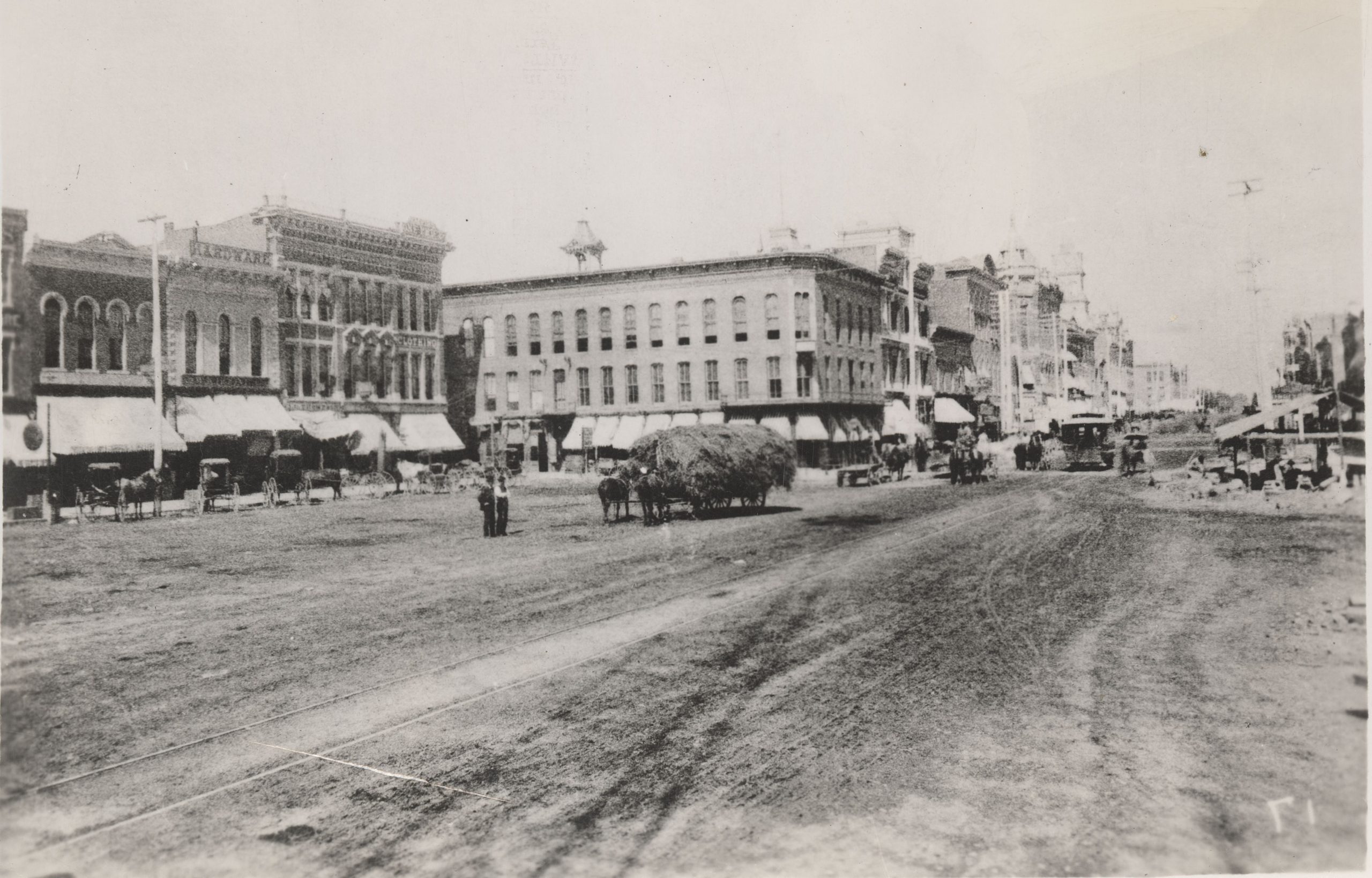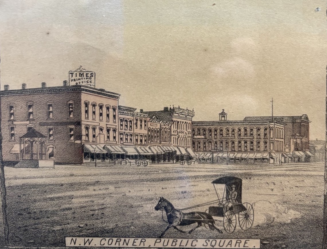 In the middle blocks, specifically at 59 Public Square, we circle back to the Ashton Hardware store, bought out by W. K. Boone and J.H. Kauke.[39] They had moved out of the Ashton block in 1866, and secured a salesroom in 59 Public Square just a few buildings north and still in the northwestern corner.[40] Likewise, right across from the building, most likely to the west, Boone was able to rent a two-story warehouse, which helped the business expand their products.[41] These new products included “a complete line of shelf hardware, mill supplies, mechanics and artisan tools, household goods, oils and varnishes.”[42] Likewise, they expanded their stock of saddlery and harnesses, paints, and building supplies.[43] They continued to be the stopping spot for anyone building in the surrounding eight counties. It was known as the hardware store that supplied building materials for the new courthouse and various other important buildings of the era.[44] The hardware store would stay there and be bought, changing name to the Cover Hardware Store, which we will follow in next month’s article.[45]
