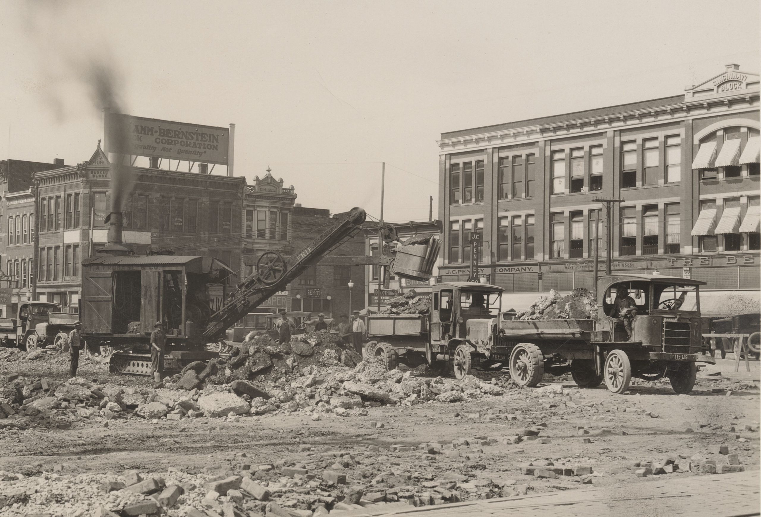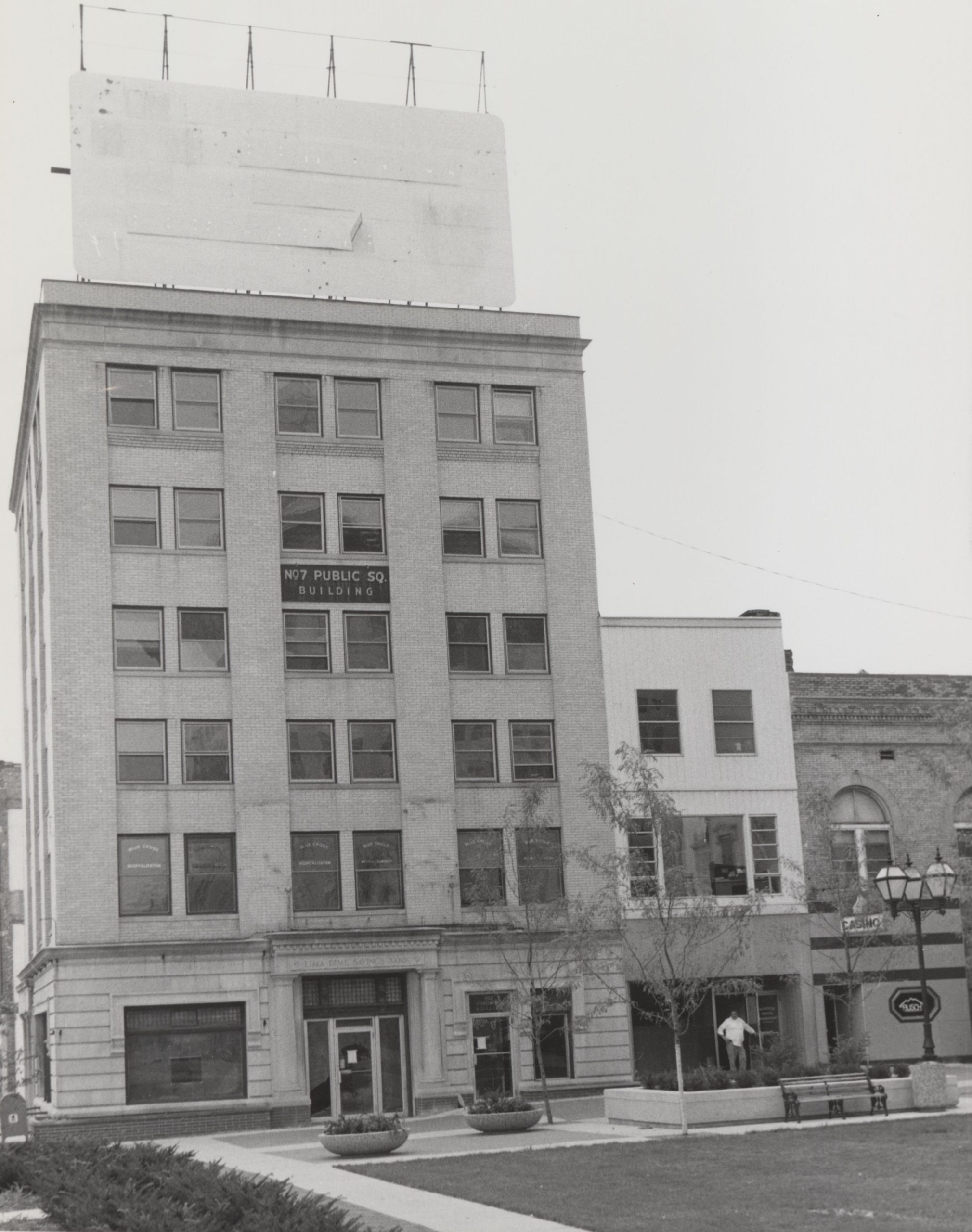 The Badeau Block still held the Lima Dime Savings Bank until early 1930. It was one of the first banks in the area to fail during the Great Depression and was liquidated in March 1930.[39] However, that does not mean the whole block failed. Many offices still ran out of it during the 1930s, most importantly the local branch of the Works Progress Administration worked from the Badeau Block.[40] The Works Progress Administration (WPA) was a part of President Roosevelt’s New Deal which gave jobs for the building of public projects like roads, airports, public parks, public buildings, and bridges.[41] During their time in Allen County, WPA workers built the Lima Post Office, McCullough Lake, later Schoonover Park, wrote a travel guide to Lima, and even helped the museum catalogue its collection.[42] Those are just some of their bigger projects. Still, all these WPA workers operated out of the Badeau Block. The block was bought out around this time by Mr. Dauch, and from then on, it was commonly called the Dauch Block.[43] During the next few decades, businesses came and went from the block. Two that are most memorable are Blue Cross – Blue Shield, the insurance company, and a One-Hour Cleaning Service, which was undoubtedly very helpful for all the working people in downtown at the time.[44] That is the end of the Badeau Block’s singular story, as well as the Cincinnati and Bowdle Blocks.