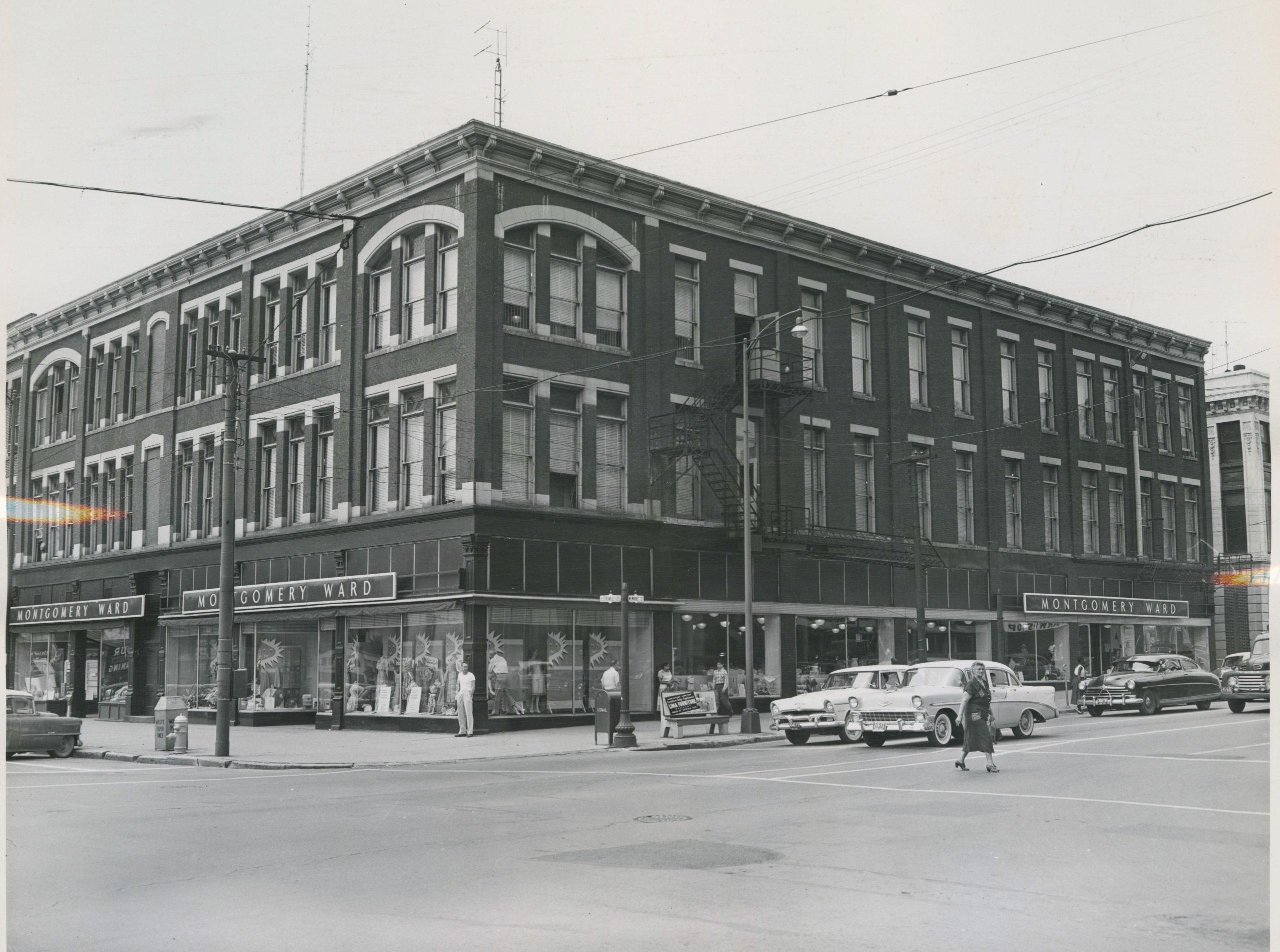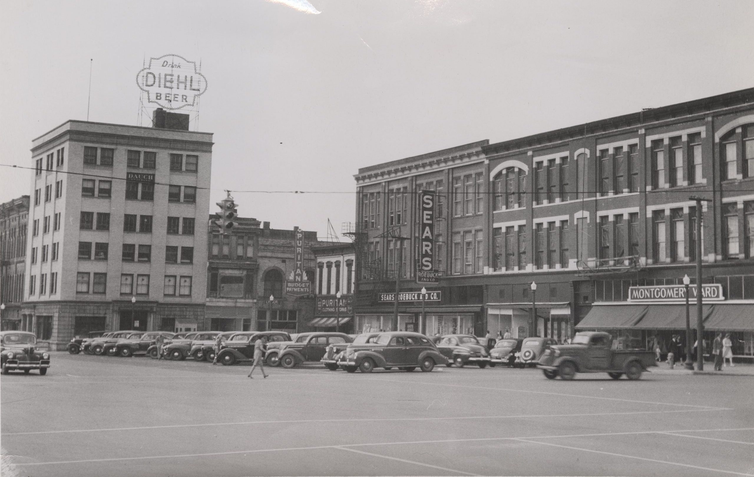 Now we move on to the time span between the 1930s and the 1960s. Those decades were a time of significant change across the Public Square, and no less so than in the Cincinnati Block, which shifted from local stores to nationwide chain stores. In 1931, Sears, Roebuck, and Co. moved into the southern half of the Cincinnati Block.[32] Uhlman’s wholesale clothing store, which was in the northern half, closed its Lima location in February 1933.[33] Only a year later, 1934, Montgomery Ward moved into the location that Uhlman’s had just vacated, and the store was expanded.[34] This is when the Cincinnati and Bowdle Block became one singular business block and their stories will converge for the rest of this story. Throughout the rest of the 1930s and even through the trials and tribulations of WWII, both Sears and Montgomery Ward thrived in Lima.[35] Both were essential stores to the downtown area during the late 1940s and 1950s. Alongside other downtown stores, like Gregg’s and Kresge’s, most shoppers in Allen County could get whatever they needed for daily life or for the holidays at these department stores. That of course changed in the middle of the 1960s as these stores moved into local malls.[36] Both Sears and Montgomery Ward moved to Lima Mall at that time, leaving the Bowdle and Cincinnati blocks empty.[37] In 1969, the block was torn down, temporarily becoming a parking lot before the Metropolitan Bank of Lima built a drive-through on the site in December of 1970.[38] We will come back to what happened next to this area after going through Badeau Block’s history for this time period.